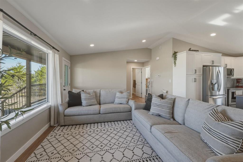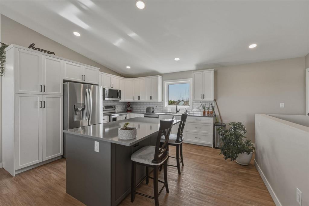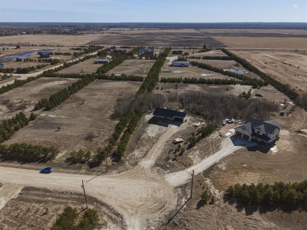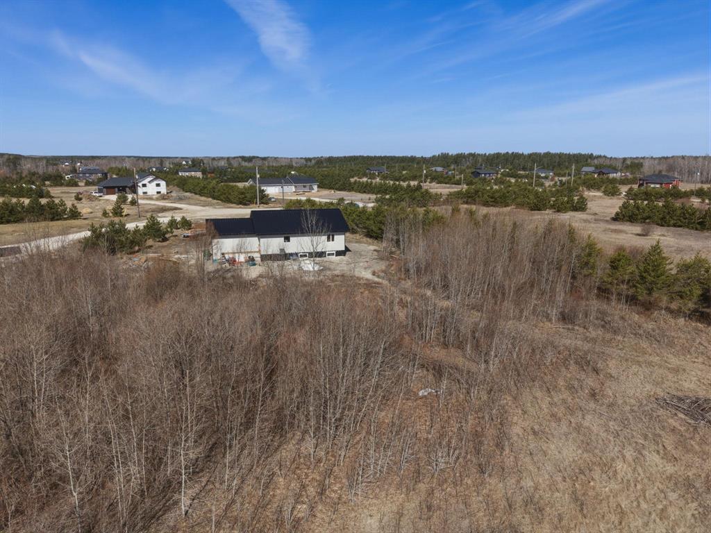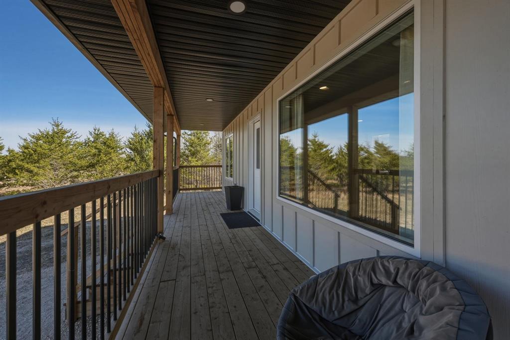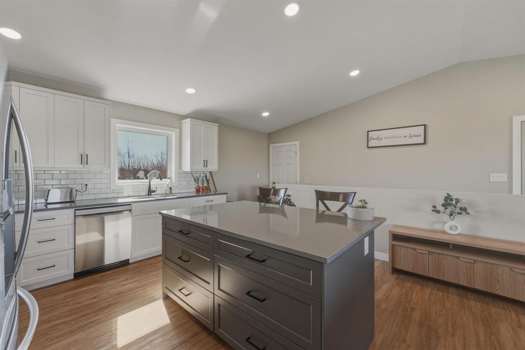 R16//Marchand/Experience the peace and privacy of country living in this recently completed (2025) 5-bedroom, 3-bathroom raised bungalow set on a picturesque pie-shaped 2-acre lot in Marchand. Surrounded by mature trees, the property offers a rare blend of natural beauty, seclusion, and scenic views. The main floor showcases a bright, open-concept design with vaulted ceilings and expansive windows that bring the outdoors in. A well-appointed chef s kitchen features quartz countertops, a tiled backsplash, and upgraded stainless steel appliances, all thoughtfully laid out for both everyday living and entertaining. The primary suite includes a private ensuite, complemented by a second bedroom and full bathroom on the main level. The fully finished lower level offers exceptional additional living space with a large rec room, three more bedrooms, a third full bathroom, and dedicated laundry. Quality finishes throughout include luxury vinyl plank flooring, modern color selections, a gas furnace, water softener, and an attached double garage. Step outside to a full-width veranda an ideal place to take in the quiet surroundings and sweeping views. A true opportunity to own a turnkey country property in a desirable setting. (id:20902)